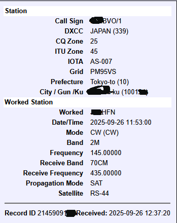 hamlogの場合 周波数はup/downの順、またADIFに出力したあと、衛星を指定するため<SAT_NAME:5>RS-44